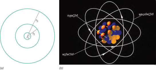 (a)බෝර් පරමාණුවේ ප්රථම ශක්ති තලා තුන (r1,r2,r3)හා පරමාණුවක න්යෂ්ටිය හා ඒවා අතර ඇති දුර පෙන්වන සටහනක් (b)පරමාණුවක ආදර්ශනයක්: දැවැන්ත ප්රෝටෝන සහ න්යුටෝන් සහිත න්යෂ්ටිය වටා කැරකෙන කුඩා ඉලෙක්ට්රෝන්.