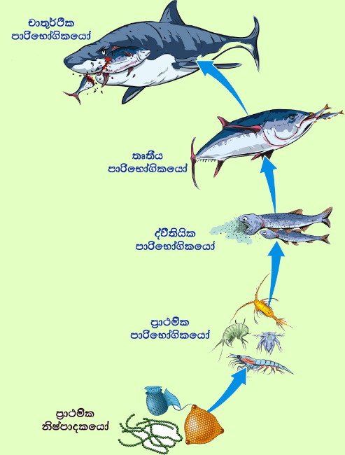 ආහාර ජාලයේ ඊළඟට සිටින්නේ පරිභෝජකයන්ය. ඔවුන් පරිභෝජනය කරන්නේ මොනවාද? වෙන කිසිවක් නොව නිෂ්පාදකයන්වය! මෙය සරලව වටහා ගැනීමට සතුන් (පරිභෝජකයින්) විසින් ශාක (නිෂ්පාකදයින්) කා දමනු ලබන්නේ යයි කල්පනා කරන්න. ශාක කා දමනු ලබන පරිභෝජකයන් ප්රාථමික පරිභෝජකයන්ය. (අපි ඔවුන්ව ශාක භක්ෂකයන් ලෙස ද හඳුනන්නෙමු.) ප්රාථමික පරිභෝජකයන් කා දමනු ලබන පරිභෝජකයන් වන්නේ ද්වීතියික පරිභෝජකයන්ය. ඔවුන් වඩා ප්රකට වන්නේ සර්ව භක්ෂක යන නාමයෙනි. ද්වීතියික පරිභෝජකයන් කා දමන තියුණු, විශාල දත් සහිත අය තෘත්තීය පරිභෝජකයන්ය. ඔවුන් අග්ර විලෝපියන් (apex predators) වශයෙන් ද හැඳින්වේ. අග්ර විලෝපියන් යයි පවසන විට ඔවුන් කවුරුන්දැයි එකවර අවබෝධ නොවීගියත් සිංහයන්, කොටියන්, මෝරුන් අග්ර විලෝපියන්ය.