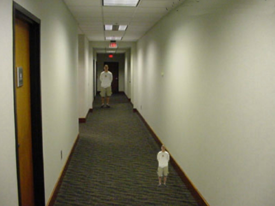 ඉහත ඡුායාරූපය දෙස බලන්න. එහි පිටු පස සිටින්නා ඉදිරියෙන් සිටින්නාට වඩා ලොකුවට පේනවා නේද? ඒත් දෙන්නාම ප්රමාණයෙන් සමානයි. ඒත් කොරිඩෝව දකින ඔබේ මනස තීන්දු කරන්නේ පිටුපස තැනත්තා ඉදිරිපස තැනත්තාට වඩා ඈතින් සිටින බවයි. ඉතින් ඒ වැඩිවන දුරට පිරිමහින්න ඔබේ මනස පිටුපස සිටින තැනත්තාගේ ප්රමාණය විශාලව පේන ආකාරයට සමායෝගීකරනවා(හරිගස්සනවා). මේ සංසිද්ධිය හoqන්වන්නේ ප්රමාණ ඒකානුකූලතාව හෙවත් ප්රමාණ සංගතතාව (size constancy) ලෙසටයි. ඉතින් මනසින් අප දකින්නේ අපේ හිසට උඩින් එක එල්ලේ ඇති අහසට වඩා සිතිජය බොහෝ ඈතින් පිහිටා ඇතැයි කියලයි. එ නිසා ඒ දුරට පිරිමහින්න අපි සඳ සිතිජයේදී වඩා විශාලව දකිනවා යන්නයි මේ සම්බන්දව විද්යාඥයන් අතර ඇති එක් මතයක් වන්නේ.