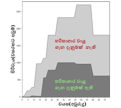 හරිතාගාර වායු ගැන දැනුමක් ඇති සහ දැනුමක් නැති ජීවන රටාවන් ගෙන යන දෙදෙනෙකු වසර 75 ජීවිත කාලය තුළ නිකුත් කරන හරිතාගාර වායු වාර්ෂික විමෝචන.මේ විමෝචන ගණන් බලා ඇත්තේ මූලයන් පහක් පාදක කර ගනිමිනි. ගමනාගමනය(Transport), නිවාඩු(Holiday), ගෙදර දොර(Household), ආහාර(Food) සහ කසල (අපද්රව්ය)(Waste) යනුවෙනි.