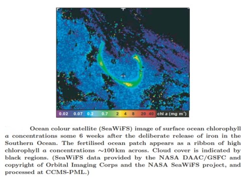 දක්ෂිණ සාගරයෙහි මුලින්ම යකඩ මුදා හැරීමෙන් සති 6 ක් ගත වූ අවස්ථාවේ සාගර මතුපිට ක්ලෝරොපිල් සාන්ද්රණ දැක්වෙන සාගර වර්ණ චන්ද්රිකා අනුරූපයක්. කළුවෙන් දැක්වෙන්නේ වළාකුලූ ආවරණයන්ය