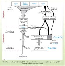 ඒ මත අවසාදිත තව තවත් තැන්පත් වෙද්දී වසර මිලියන ගණනක් ගෙවී යන විට ගොහොරුව තව තවත් යටටම වැළලිගියේය. එය කිලෝමිටර තුනක ගඹුරකට පැමිණෙන විට යටින් එන තාපයෙන් සහ උඩින් ඇතිවන පීඩනය කරනකොට ගෙන ඓන්ද්රීය අණු පිසෙන්නට පටන් ගත්තේ ඒවා සරල හයිඩ්රොකාබන් දාම හැටියට බිඳ දමමිනි. මෙහි ප්රථම නිෂ්පාදනය වූයේ කෙරොජන්(kerogen) යනුවෙන් දැක්වෙන ඉටි වැනි ඝනයකි. මේවා තවවදුරටත් බිඳ දමනු හෙවත් පළා දමනු ලැබුවේ පෙට්ට්රෝලියම් යනුවෙන් හඳුන්වනු ලබන ද්රව හයිඩ්රොකාබන් මිශ්රනයක් හා එක්ව මීතේන් හෝ ස්වාභාවික වායු මිශ්රනයක් සාදමිනි. සමහර අවස්ථාවල උෂ්ණත්වය වුවමනාවට වඩා ඉහළින් පැවතීම නිසා සියලු ඓන්ද්රීය ද්රව්ය මීතෙන් හැටියට බිඳ දැමිණ. මෙකී ‘අධිපිසීම‘ (පමණ ඉක්මවා පිසීම) සාමාන්යෙයන් සිදුවන්නේ තැන්පතුව කිලෝමීටර 5කට වඩා යටින් තිබෙන විටය.