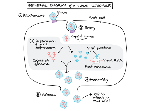ආකෘතික වයිරසයක් ගතහොත් ජීවන චක්රය, (ඒ ඒ වෛරස් ඒ සඳහා මෙම පියවර වල විස්තර වෙනස් වන නමුත්) පුළුල් පියවර පහකට බෙදිය හැකිය.