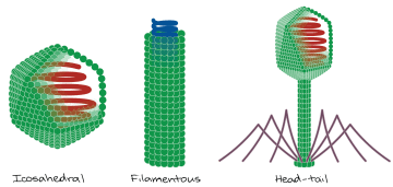 - සූත්රිකාමය (Filamentous) කැප්සිඩ: මේවා නම් කර ඇත්තේ ඒවායේ රේඛීය, තුනී, රැහැන් ආකාර පෙනුම අනුවය. ඒවාට දණ්ඩක් වැනි හෝ හෙලික්සිය (helical) යන්න ද යෙදිය හැකිය.