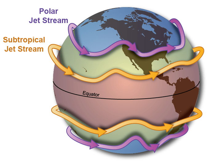 සාමාන්යය වශයෙන් ගත්හොත් ක්ෂේප හෙවත් ජෙට් ධාරා, බටහිර සිට නැගෙනහිරට පෘථිවිය වටා හමා යයි. එසේ ගමන් කරන්නේ, මහ පොළව මත එහාට් මෙහාට දඟර ගැසෙමි වක්රාකාර මාර්ගයක් අනුගමනය කරමින් ගලන ගඟක් මෙනනි. එක්සත් ජනපද අහස හරහා ක්ෂේප හෙවත් ජෙට් ධාරාව කිසි විටෙකත් එක තැනක රැඳෙන්නේ නැත – එය තව තවත් දකුණට චලනය වෙමින් ශීත සෘතුවේ දී තදින් හමා යන්නේ වී නමුත් ගිම්හානයේදී ඒ තරම් තදින් හමන්නේ නැත.