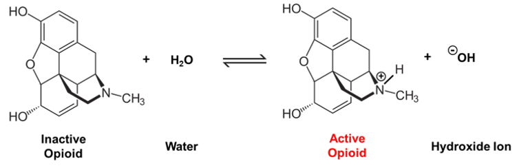 මෙම ධන ආරෝපිත ව්යුහය වනාහි ඔපියොයිඩවල ජෛව රසායනිකව ක්රියාකාරී ස්වරූපයයි – මෙම ධනාත්මක ආරෝපණය ලබා ගන්නා තෙක් එය ඔබේ ශරීරයට කිසිදු බලපෑමක් ඇති නොකරනු ඇත. නයිට්රජන් මත ඇති ධනාත්මක ආරෝපණය වේදනාව උත්පාදනය වන (සිරුරේ) ඉලක්කගත ස්ථානයට බන්ධනය වී සහනයක් ලබා දීම උදෙසා මෙම ඖෂධ උපකාරීවේ.