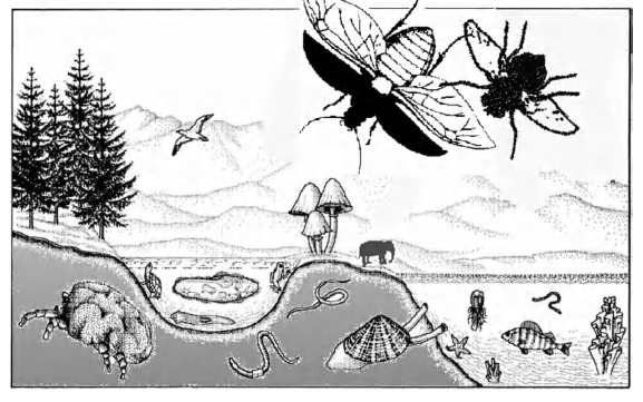 ජීව ලෝකයෙහි විවිධත්වය දක්වන චිත්රයක්. මෙහි සත්ව හා ශාක නිරූපනය කරන්නේ දැනසිටින සත්ව/ශාක විශේෂ සංඛ්යාවන්ගේ අනුපාතය අනුවය. උදාහරනයක් හැටියට අලියා, සියළු ක්ෂීරපායින් නියෝජනය කරයි; සරල වෘක්ෂය(the pine tree) සම්පූර්ණ ශාක රාජධානියයි; කුරුමිණියා සහ මැස්සා කෘමී විශේෂ සංඛ්යාව නියොජනය කරති. (අනුග්රහය: HANDBOOK OF AGRICULTURAL ENTOMOLOGY by H.F. van Emden)