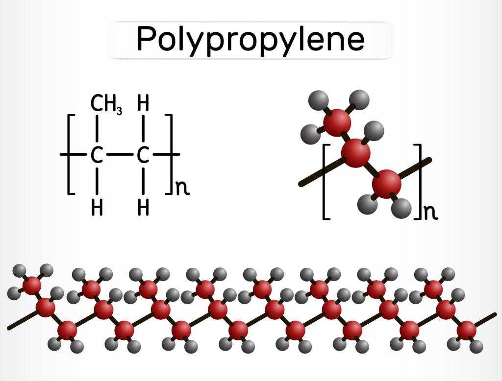 මෙම රූපයේ දැක්වෙන්නේ පොලිප්රොපිලීන් අණුවක රසායනික ව්යුහයයි (ඉහළ වමේ), අණුවේ ආකෘතියක් (ඉහළ දකුණේ) සහ බහුඅවයවකයක්(}polymer) සෑදීම සඳහා එකට සම්බන්ධ වූ පොලිප්රොපිලීන අණු දාමයක්.