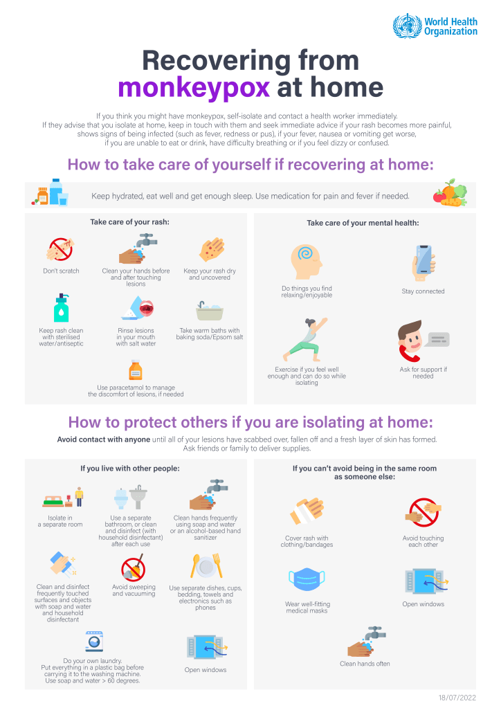 ඔබට වඳුරු රෝග ලක්ෂණ ඇතැයි ඔබ සිතන්නේ නම්, උපදෙස්, පරීක්ෂණ සහ වෛද්ය ප්රතිකාර සඳහා ඔබේ සෞඛ්ය සේවා සපයන්නා අමතන්න. ඔබගේ පරීක්ෂණ ප්රතිඵලය ලැබෙන තුරු, හැකිනම් අන් අයගෙන් හුදෙකලාව සිටින්න. නිතරම ඔබේ දෑත් පිරිසිදු කරන්න.