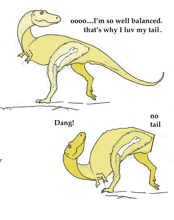 විද්යාඥයින් විශ්වාස කරන්නේ මාංශ භක්ෂක ද්විපාදික ඩයිනසෝරයකු වන ටිරැනසෝරයා(Tyrannosaurus rex) ඇතුළු ඩයිනෝසෝරයන් පාද දෙකෙන් ඇවිදින විට ඔවුන්ගේ බර අධික හිස් සහ සිරුරු සමතුලිත කිරීම පිණිස ඔවුන්ගේ වලිග පැත්තෙන් පැත්තට පද්දන්නට ඇති බවයි. මෙම චලනය ඔවුන්ගේ ගොදුර අල්ලා ගැනීමට තරම් වේගයකින් දුව යාමට කිරීමට ඔවුන්ට හැකියාව ලබ දෙන්නට ඇත. ඒ හා සමානව, වර්තමානයේ කැන්ගරුවෝ විවෘත භූමිය හරහා පනින විට සමබරතාවය සඳහා ඔවුන්ගේ වලිගය භාවිතා කරති. එහෙත් ඔවුන් එය හුදෙක් ඔවුන්ගේ බර ප්රතිතෝලනය සඳහා භාවිතා කරන්නේ නැත. කැන්ගරුවාගේ වලිගය ප්රබල තෙවැනි පාදයක් ලෙසද ක්රියා කරන අතර එය, ඔවුන් අවකාශය හරහා වේගයෙන් ඉදිරියට පැනීමට උපකාරී වේ.
