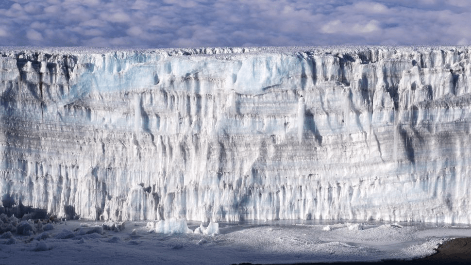 ටැන්සානියාවේ දකුණු අයිස් කෙත ග්ලැසියරය පෙන්නුම් කරන කිලිමන්ජාරෝ කඳු මුදුනේ අයිස් පවුරක්.