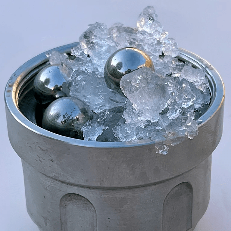 කණ්ඩායම විසින් ස්ඵටිකීකරණය කරන ලද අයිස් ඇඹරීමට, ඛනිජ සැකසීමේදී ද්රව්ය ඇඹරීමට හෝ මිශ්ර කිරීමට සාමාන්යයෙන් භාවිතා කරනු ලබන මෙවලමක් වන ඇඹරුම් මෝලක්(බල්ල් මිල්ල්) යොදා ගන්නා ලදී. ඇතුළත ලෝහ බෝල සහිත කන්ටේනරයක් භාවිතා කරමින්, ඔවුන් තත්පරයට 20 වතාවක් පමණ වේගයකින් අයිස් කුඩා ප්රමාණයක් සොලවා ඇත. එය සුදු කුඩු බවට බිඳ දමමින් ලෝහ බෝල මගින් අයිස් මත ‘ව්යාකෘති බලයක්’ ((‘shear force’) නිපදවනු ලැබූ බව සල්ස්මන් පවසයි.