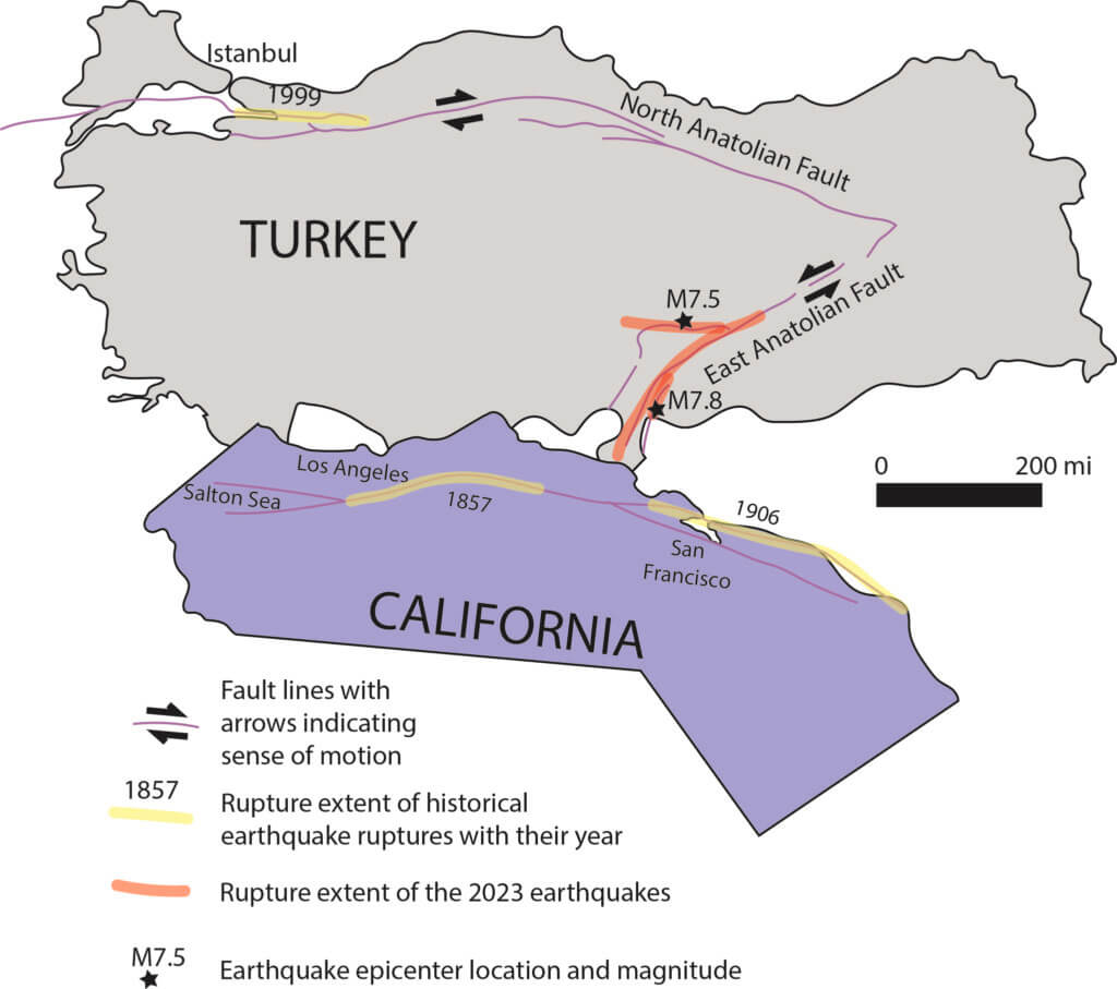 උතුරු ඇනටෝලියානු විභේදය සහ නැගෙනහිර ඇනටෝලියානු විභේදය යන ප්රධාන විභේදය දෙකක් අතර තුර්කියේ වැඩි කොටසක් ඇනටෝලියානු තටිය මත පිහිටා ඇත. සිරියාව ඇතුළු අරාබිය රැගෙන යන භූකාරක තැටිය(tectonic plate) උතුරු දෙසට ගමන් කරමින් යුරේසියාවේ දකුණු මායිම සමඟ ගැටෙමින් බටහිර දෙසට තුර්කිය තෙරපමින් සිටින බව එක්සත් රාජධානියේ මිල්ටන් කේන්ස් හි විවෘත විශ්ව විද්යාලයේ භූ විද්යාඥ ඩේවිඩ් රොතරි පවසයි. “තුර්කිය නැගෙනහිර ඇනටෝලියානු විභේදය දිගේ වසරකට සෙන්ටිමීටර 2 ක් පමණ බටහිර දෙසට ගමන් කරයි,” ඔහු තවදුරටත් පවසයි. “මෙම විභේදයේ දිගෙන් අඩක් දැන් භූමිකම්පා වලින් ගහන වී ඇත.”