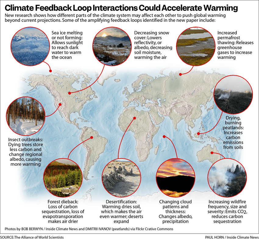 “ප්රතිපෝෂණ විස්තාරණය කිරීම ප්රමාණවත් තරම් ප්රබල නම්, ප්රතිඵලය වනු ඇත්තේ මිනිසුන්ට පාලනය කළ හැකි ඕනෑම දෙයකින් ඔබ්බට යන ඛේදජනක දේශගුණික විපර්යාස විය හැකිය” යනුවෙන් ඔරිගන් ප්රාන්ත විශ්ව විද්යාලයේ පරිසර විද්යාඥයෙකු සහ ලෝක විද්යාඥයින්ගේ සන්ධානයේ සම-නිර්මාතෘ සම-කර්තෘ බිල් රිපල් පෙන්වා දෙයි. ලෝක විද්යාඥයින්ගේ සන්ධානයට රටවල් 180 ක සාමාජිකයින් 26,000 ක් සිටිති. 2015 පැරිස් ගිවිසුම යටතේ රජයන් විසින් කරන ලද ප්රතිඥාවලට අනුකූලවෙමින්, ගෝලීය උණුසුම මැඩපැවැත්වීම සඳහා වන ප්රතිපත්ති තීරණාත්මක ලෙස ක්රියාත්මක කරන්නැයි මෙම සංධානය බලකර ඉල්ලා සිටියි.