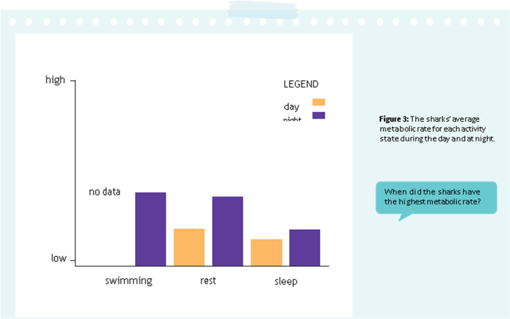 රාත්රියේදී මෝරුන් වඩාත් ක්රියාශීලී බව ප්රතිඵලවලින් තහවුරු විය. පිහිනන විට ඔවුන්ගේ පරිවෘත්තීය වේගය ඉහළම මට්ටමක සහ නිදා සිටින විට අඩුම මට්ටමක විය . පරිවෘත්තීය අනුපාතය ද පර්යේෂකයන්ගේ දත්ත පෙන්නුම් කළ අකාරයට එක් එක් ක්රියාකාරකම සඳහා දිවා රෑ අතර වෙනස් විය .