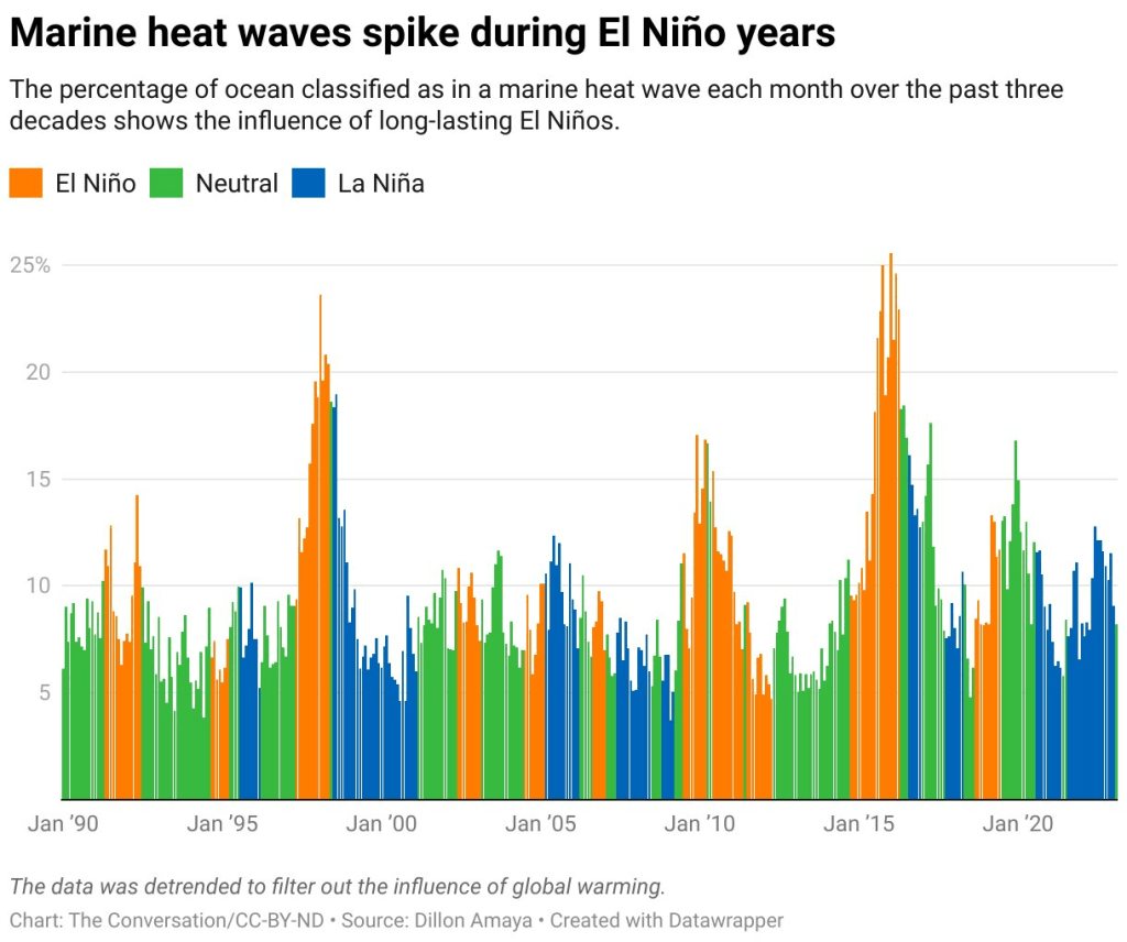 ගෝලීය සාගර උෂ්ණත්වය දැනටමත් ඇත්තේ වාර්තාගත ඉහළ මට්ටමකය. එබැවින් එල් නිනෝ ප්රේරිත සමුද්ර තාප තරංග, මසුන් අල්ලන සංවේදී ප්රදේශ බොහොමයක් බිඳවැටීමේ ලක්ෂ්යයක් කරා තල්ලු කළ හැකිය.