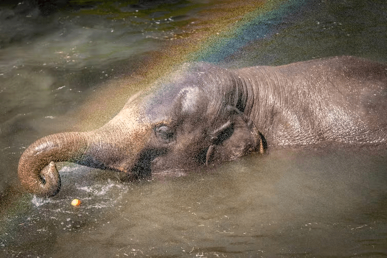 මේ ඇතා දේදුන්නක් ඇතුළේ නාමින් ඉන්නවා වගේ පෙනුනත් ඇතාට ඒ විදියටම පේන්නේ නැහැ. Mads Claus Rasmussen / Ritzau Scanpix / AFP