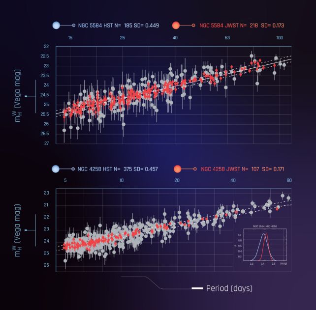 Cepheid විචල්ය දුර මිනුම් හබල් (අළු) සහ JWST (රතු) සමඟ ගන්නා ලදී. (NASA, ESA, CSA, J. Kang/STScI; Science: A. Riess/STScI)