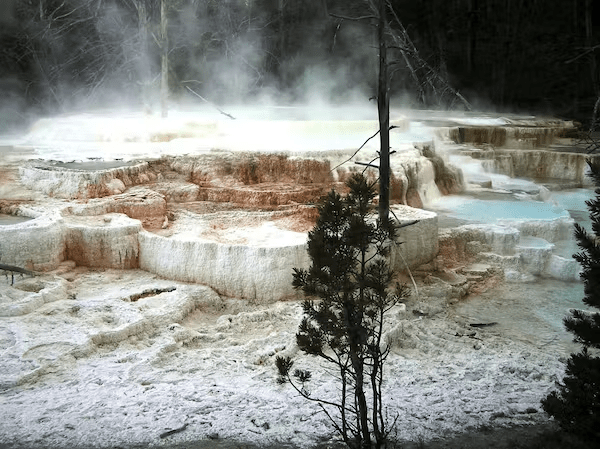වයෝමිං හි Yellowstone ජාතික වනෝද්යානයේ Mammoth Hot Springsහි ට්රැවර්ටයින් උත්තාට උණු දිය උල්පත් තරල සිසිල් කර කාබන් ඩයොක්සයිඩ් මුදා හරින විට ට්රැවර්ටයින් තැන්පත් වීම නිසා හෙල්මළු තටාක සෑදේ. USGS