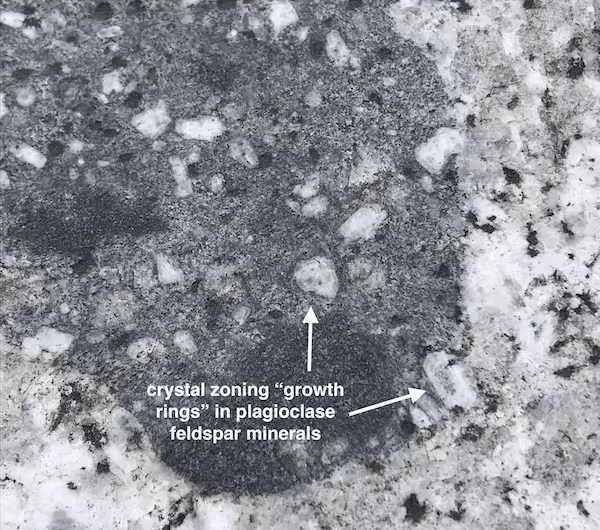 බ්රිටිෂ් කොලොම්බියාවේ ස්කොමිෂ් අසල ග්රැනෝඩියොරයිට් පාෂාණයේ වර්ධන වළලු සහිත ෆෙල්ස්පාර් ස්ඵටික(Feldspar crystals). Natalie Bursztyn, CC BY-ND