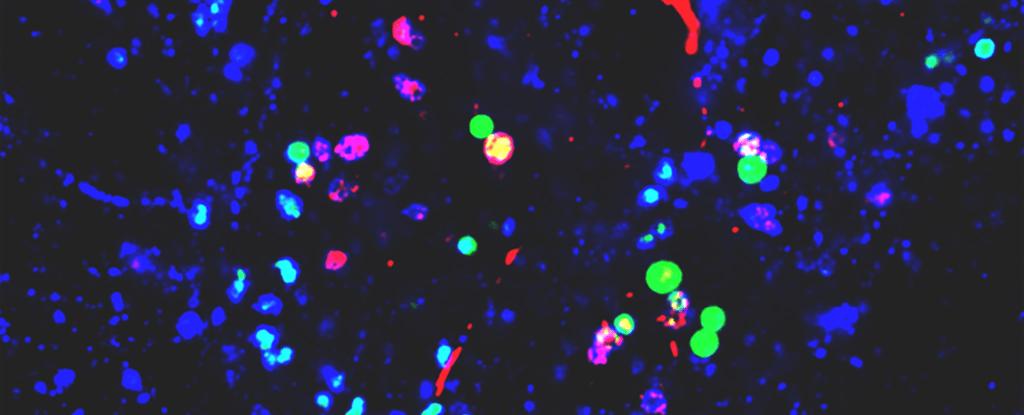 ප්ලාස්ටික් නැනෝ අංශු (කොළ), ප්රෝටීන් පොකුරු (රතු) සහ ලයිසොසෝම (නිල්).(ඩියුක් විශ්වවිද්යාලය)