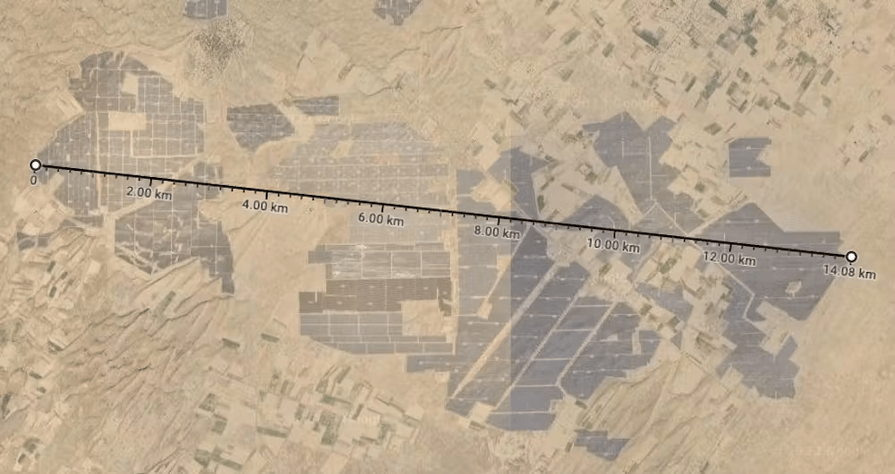 විභව ඉලක්කයක්? ඉන්දියාවේ කාන්තාරයක ඇති විශාල භද්ලා සූර්ය උද්යානය එක් කොනක සිට අනෙක් කොනට කිලෝමීටර 14 (සැතපුම් 8.7) කි. Google Maps, CC BY-SA