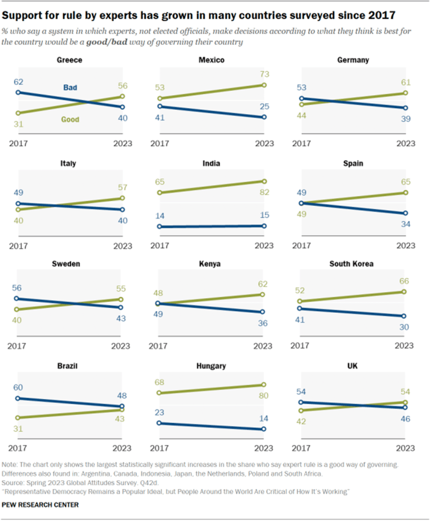 ප්රබල නායකයෙකුට අධිකරණයේ හෝ පාර්ලිමේන්තුවේ මැදිහත්වීමකින් තොරව තීරණ ගත හැකි රජයක් සඳහා වන සහයෝගය 2017 වසරේ සිට රටවල් 22 න් 8 ක වැඩි වී තිබේ.