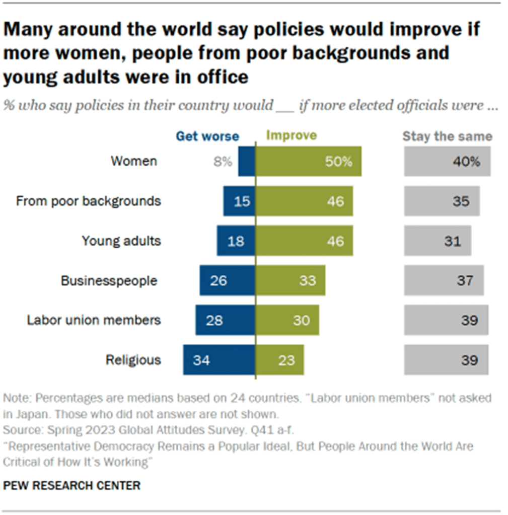 බොහෝ දෙනා පවසන්නේ කාන්තාවන්, දිළිඳු පසුබිමක අය සහ තරුණ වැඩිහිටියන් වැඩිපුර තේරී පත් වන නියෝජිතයන් නම් නිලධාරීන් නම් තම රටේ ප්රතිපත්ති දියුණු වනු ඇති බවයි.