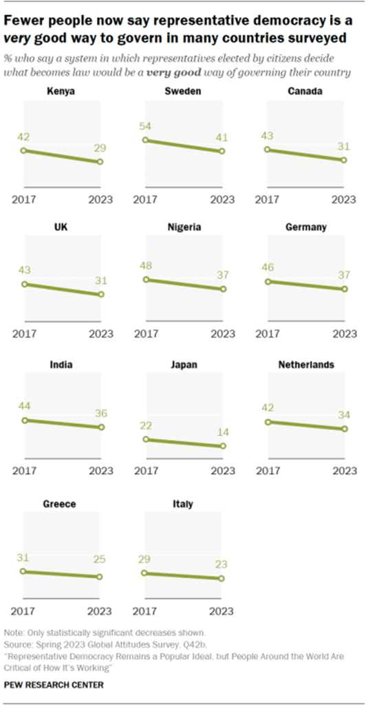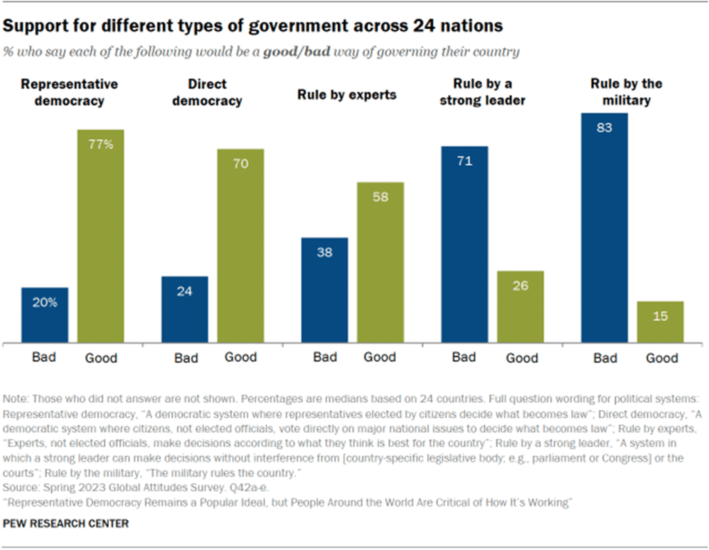 2023 දී Pew පර්යේෂණ මධ්යස්ථානය විසින් සමීක්ෂණය කරන ලද එක් එක් රටවල් 24 න් පැහදිලි බහුතරයක්, නියෝජිත ප්රජාතන්ත්රවාදය නැතිනම් පුරවැසියන් විසින් තේරී පත් වූ නියෝජිතයන් විසින් නීති බවට පත්විය යුත්තේ කුමක් දැයි තීරණය කරණු ලබන, තම රට පාලනය කිරීමට තරමක් හොඳ හෝ ඉතා හොඳ ප්රජාතන්ත්රවාදී ක්රමයක් ලෙස විස්තර කරයි.