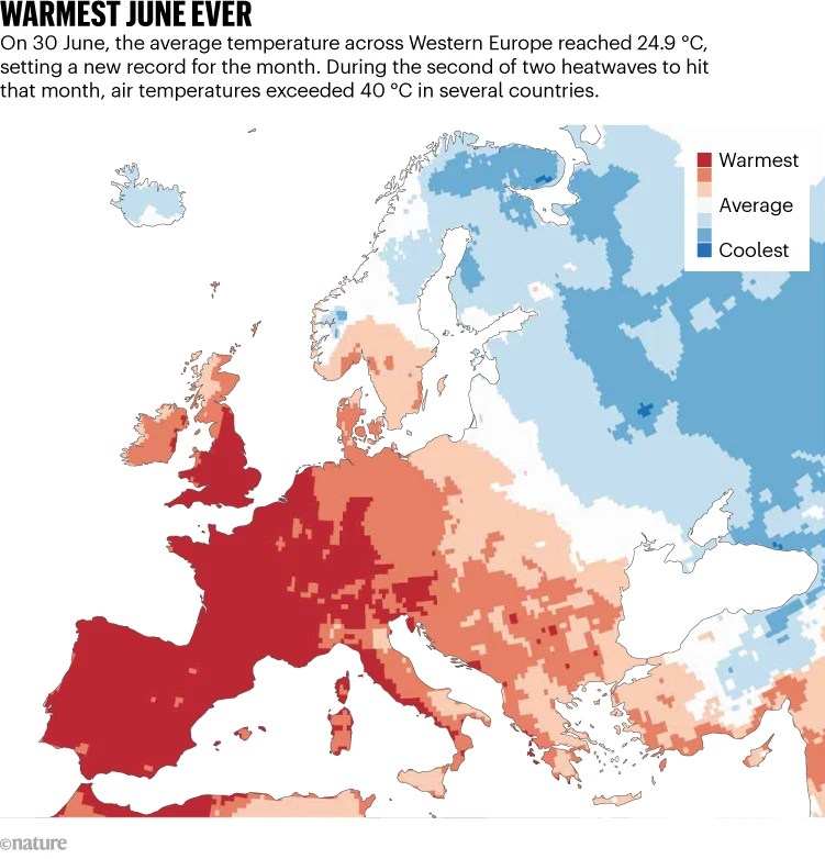 ජූනි මස මැද භාගයේ සිට ජූලි මස මුල දක්වා, බටහිර යුරෝපය දශක ගණනාවකින් මෙම කාල පරිච්ඡේදය සඳහා වූ ඉහළම සාමාන්ය උෂ්ණත්වය අත්විඳින ලද අතර, එය වාර්තාගත ඉහළම උෂ්ණත්වයක් සහිත ජූනි මාසය විය (‘උණුසුම්ම ජූනි මාසය’ සටහන බලන්න). ‘තාප ගෝලාකාර’ (heat domes) — එනම්, යම් ප්රදේශයක් පුරා වායුගෝලයේ උණුසුම් වාතය සිරකරන අධි පීඩන තත්වයක් නිසා, එම ප්රදේශය දිගු කලක් උණුසුම්ව පැවතීමට හේතු වීම හේතුවෙන් ස්පාඤ්ඤයේ සහ පෘතුගාලයේ උෂ්ණත්වය සෙල්සියස් අංශක 40 ඉක්මවා, ඇතැම් විට 46 දක්වා ඉහළ ගියේය.